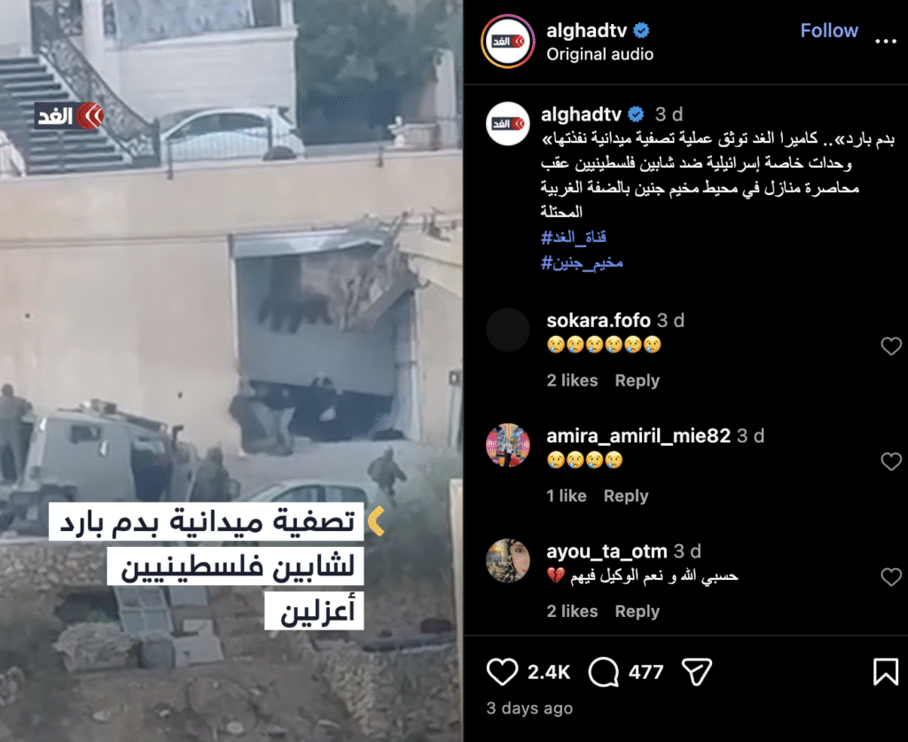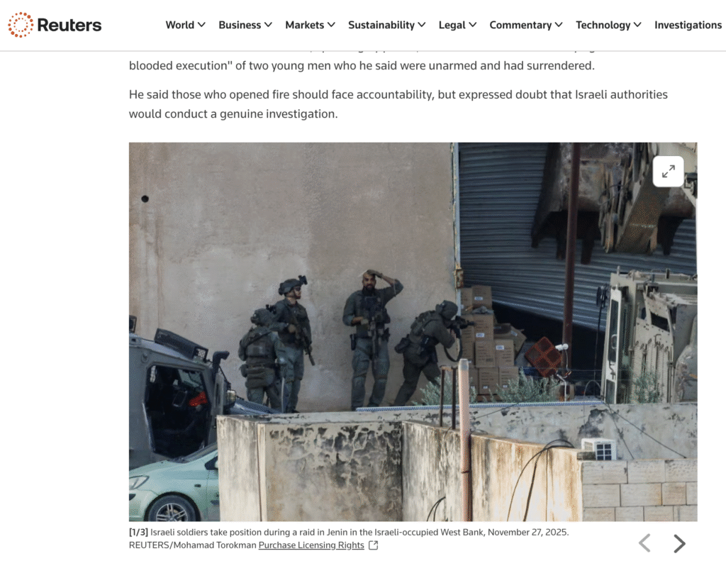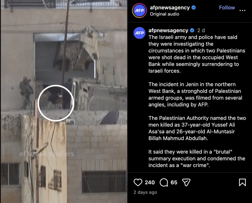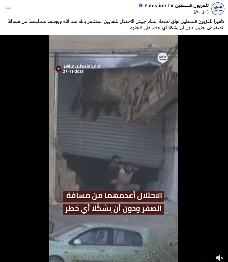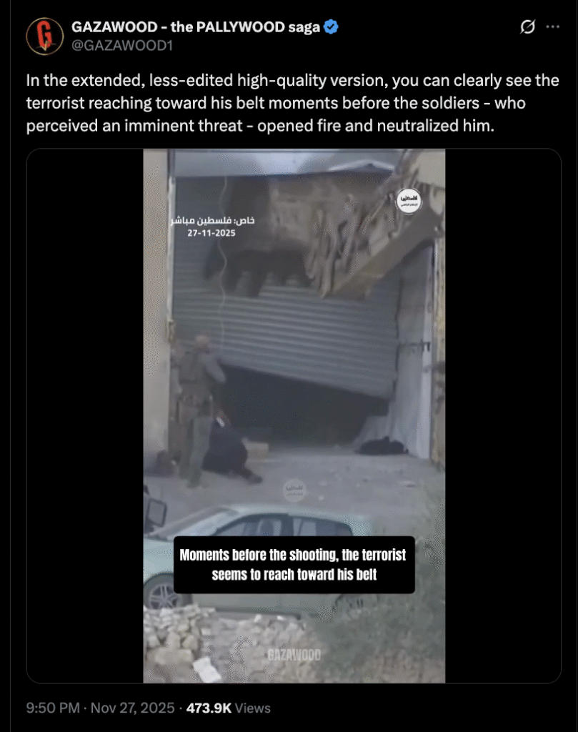 نشر حساب Gazawood على منصة X وحسابات أخرى مقطع فيديو يطلق فيه جيش الاحتلال النار على الشابين يوسف عصاعصة والمنتصر بالله عبد الله في جنين بتاريخ 27/11/2025، مع الادعاء بأن أحدهما مدّ يده إلى حزامه وشكّل تهديدًا ما دفع الجنود لإطلاق النار عليهما. حيث جاء في الادعاء: “وفي النسخة الموسعة عالية الجودة، والتي لم تخضع لتحرير كبير، يمكنك أن ترى بوضوح الإرهابي وهو يمد يده إلى حزامه قبل لحظات من قيام الجنود – الذين شعروا بوجود تهديد وشيك – بفتح النار عليه وتحييده”.