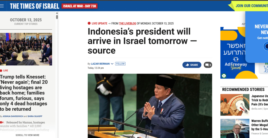 تداولت وسائل إعلام إسرائيلية وحسابات على مواقع التواصل الاجتماعي معلومات تدعي أن الرئيس الإندونيسي برابوو سوبانتو سيصل إلى دولة الاحتلال يوم الثلاثاء 14 تشرين الأول 2025.