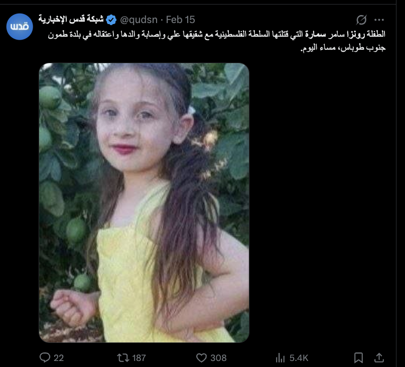انتشرت على مواقع التواصل الاجتماعي صورة لطفلة ترتدي فستانًا أصفر، مع الادعاء أنها الطفلة رونزا سمارة التي أُصيبت مع عائلتها خلال حادثة إطلاق النار من قبل أجهزة أمن السلطة الفلسطينية على عائلتها في بلدة طمون بتاريخ 15/2/2026.