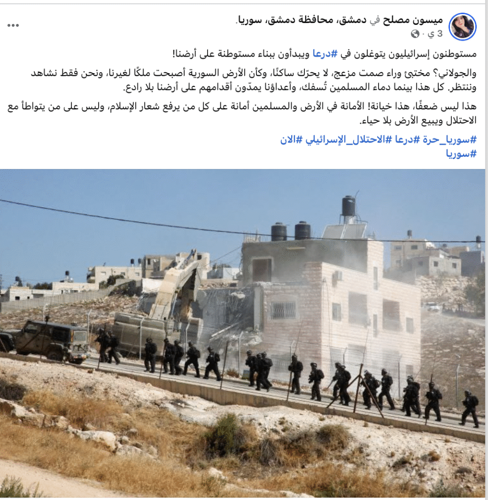 انتشر على مواقع التواصل الاجتماعي صورة يظهر فيها مجموعة من جنود الاحتلال برفقة آليات عسكرية ومن خلفهم مبانٍ، مع الادعاء أن الصورة حديثة لمستوطنين إسرائيليين يتوغلون في درعا ويبدأون ببناء مستوطنة في سوريا. حيث أرفقت الصورة بالوصف التالي: “مستوطنون إسرائيليون يتوغلون في #درعا ويبدأون ببناء مستوطنة على أرضنا!”.