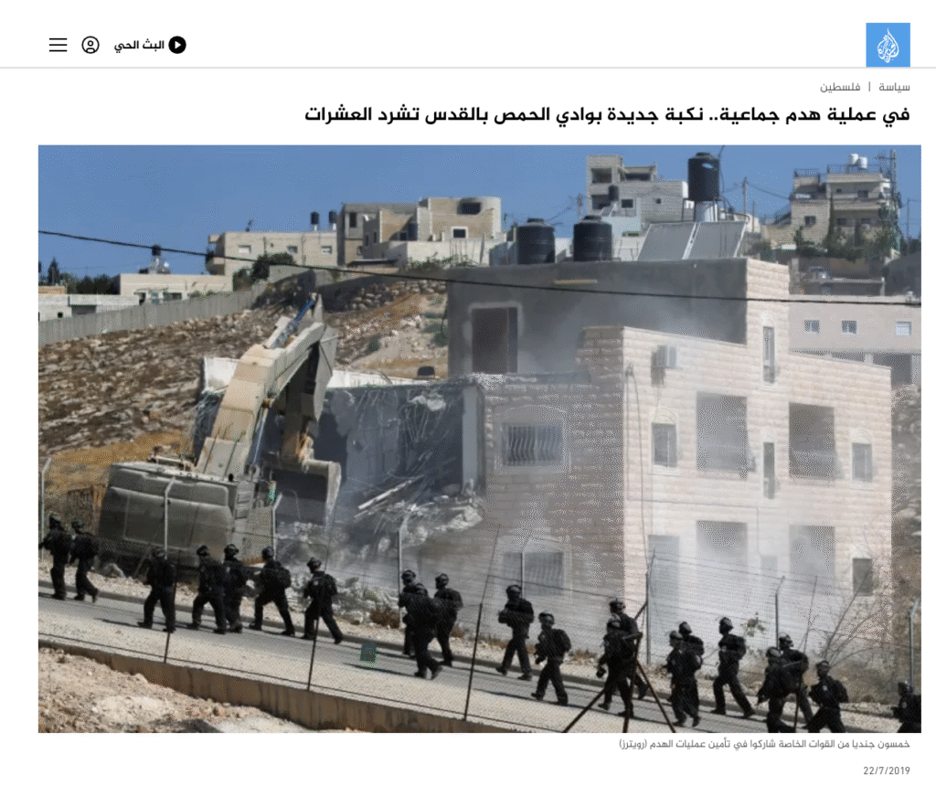 نشرت الصورة قناة الجزيرة بتاريخ 22\7\2019 مرفقةً بتقرير مع العنوان التالي: “في عملية هدم جماعية.. نكبة جديدة بوادي الحمص بالقدس”. وأشار التقرير أن قوات كبيرة من جيش الاحتلال برفقة ما يزيد على عشرين آلية اقتحمت قرية وادي الحمص، لتنفيذ قرار الهدم بحق 11 عمارة سكنية من أصل 16 عمارة مهددة، أي ما يقارب مئة شقة سكنية، بعضها مأهول وبعضها لا يزال قيد الإنشاء.