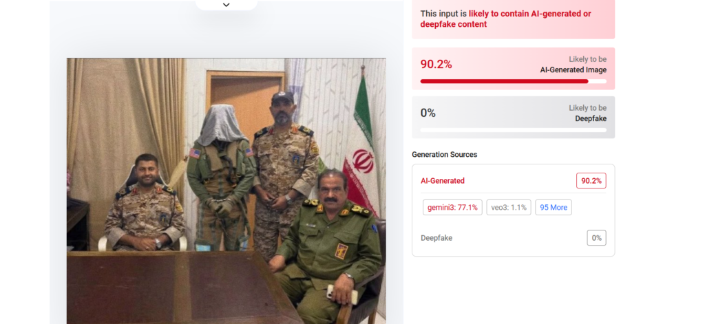 ومن خلال التدقيق في الصورة، ظهرت مجموعة من التشوهات البصرية التي تدل على ذلك، أبرزها: وجود تشابه لافت في الساعات، ووجود تفاصيل غير دقيقة في الزي العسكري والشعارات، الستائر والجدار تحتوي على أنماط متكررة وغير منتظمة بشكل طبيعي، إضافة إلى نظرة العيون حيث لا ينظر جميعهم بنفس الزاوية الطبيعية رغم أن الأشخاص في وضعية تصوير واحدة، كما ويوجد تشوه في تفاصيل باطن الأيدي، حيث تبدو يد الشخص الجالس على الجهة اليسرى غير طبيعية وتفتقر إلى التناسق والدقة في رسم الأصابع.