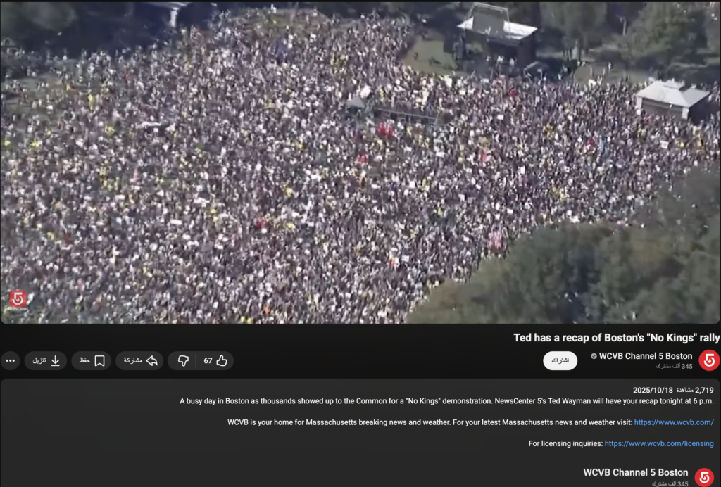 كما ونشرت قناة WCVB Channel 5 Boston مجموعة من اللقطات ومن ضمنها مقطع الفيديو، على حسابها الرسمي على اليوتيوب، بتاريخ 18\10\2025، مرفقاً بالنص التالي: “يوم حافل في بوسطن، حيث توافد الآلاف إلى الساحة العامة للمشاركة في مظاهرة لا ملوك”.
