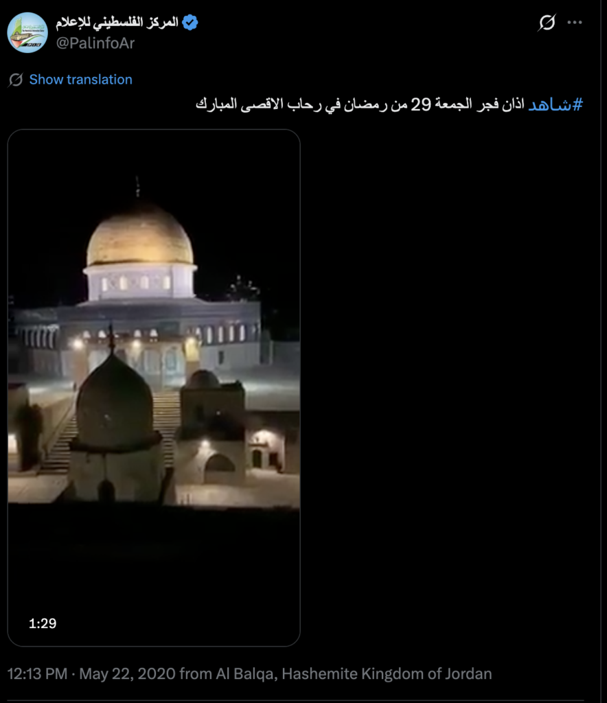 كما نشر المركز الفلسطيني للإعلام المقطع ذاته بتاريخ 22/5/2020، مرفقًا بالوصف التالي: ”#شاهد⁩ أذان فجر الجمعة 29 من رمضان في رحاب الأقصى المبارك”.