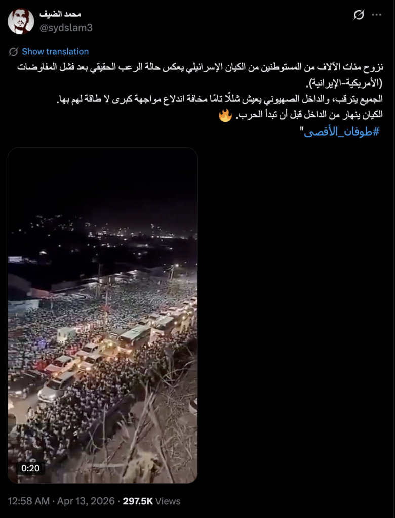 نشرت حسابات على مواقع التواصل الاحتماعي مقطع فيديو يظهر فيه اكتظاظ  للمركبات وتجمهر أعداد كبيرة من المواطنين في أحد الشوارع، مع الادعاء بأنه يوثق نزوح أعداد كبيرة من المستوطنين من دولة الاحتلال عقب فشل المفاوضات الأمريكية الإيرانية. وأُرفق الفيديو بالنص التالي: “عدد كبير نزوح مئات الآلاف من المستوطنين من الكيان الإسرائيلي يعكس حالة الرعب الحقيقي بعد فشل المفاوضات (الأمريكية-الإيرانية). الجميع يترقب، والداخل الصهيوني يعيش شللًا تامًا مخافة اندلاع مواجهة كبرى لا طاقة لهم بها. الكيان ينهار من الداخل قبل أن تبدأ الحرب”.
