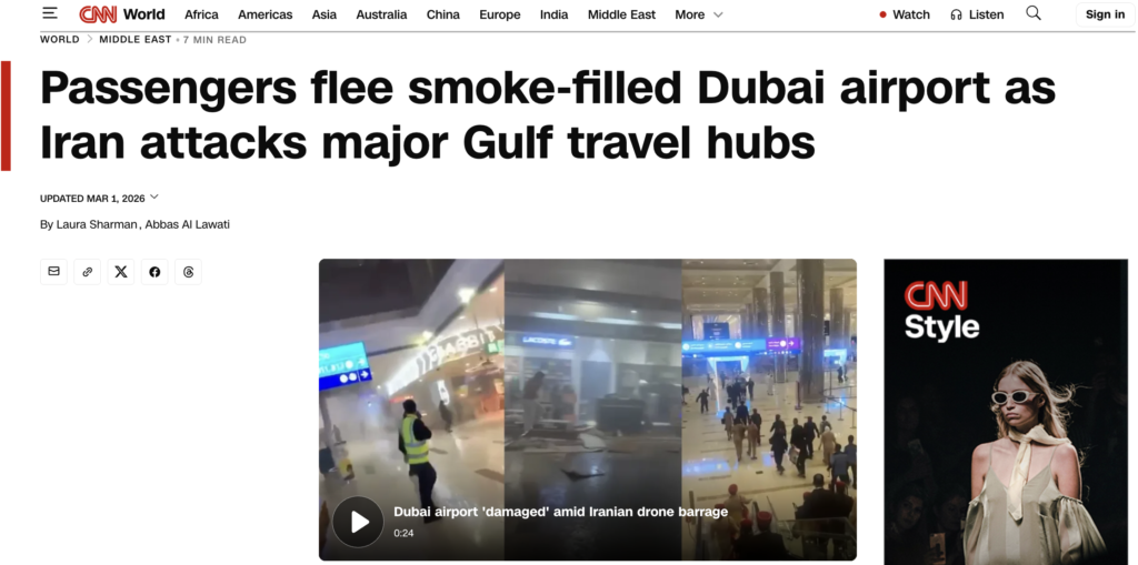 ونشرت شبكة CNN مقطع الفيديو بتاريخ 1/3/2026، موضحةً أنه يوثق فرار المسافرين من مطار دبي الذي امتلأ بالدخان، بالتزامن مع شنّ إيران هجمات على مراكز سفر رئيسية في الخليج.