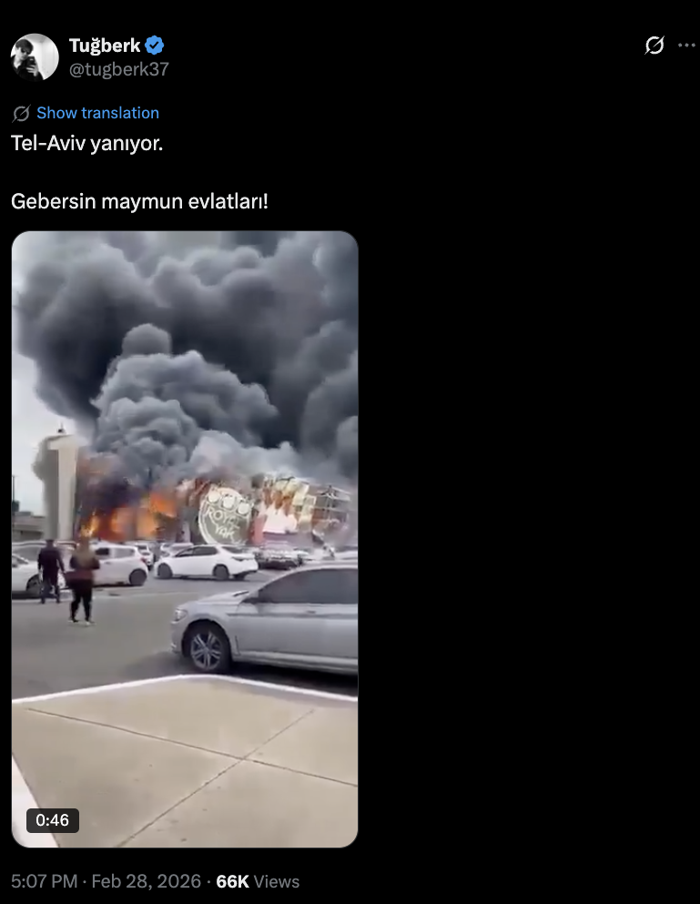 نشرت حسابات على مواقع التواصل الاجتماعي مقطع فيديو يظهر انفجاراً ضخماً في مجمع تجاري، مع تصاعد السنة اللهب منه، مدعية أنه يوثق سقوط صاروح إيراني في تل أبيب، وأرفق المقطع بالوصف ” تل أبيب تحترق”