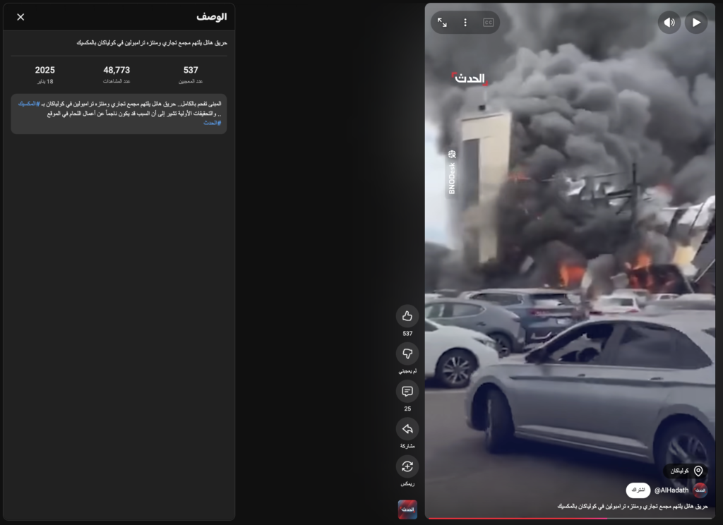 كما ونشرت قناة Kurdsat عربية على حسابها الرسمي في فيسبوك مقطع الفيديو في ذات التاريخ، وأشارت إلى أن حريقاً هائلاً اندلع في بلازا سينيبوليس في كولياكان بالمكسيك.