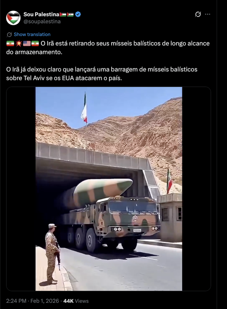 نشرت حسابات على مواقع التواصل الاجتماعي مقطع فيديو يظهر فيه آليات عسكرية تحمل صواريخ ضخمة، وخلفها سارية تحمل علم إيران، وشخص يرتدي الزي العسكري، مع الادعاء بأن الفيديو حديث ويوثّق إخراج إيران صواريخها الباليستية بعيدة المدى من مخازنها. حيث ارفق الفيديو بالوصف التالي: “إيران تُخرج صواريخها الباليستية بعيدة المدى من مخازنها، ومن المحتمل أن تطلق إيران وابلاً من الصواريخ الباليستية على تل أبيب إذا هاجمت الولايات المتحدة إيران”.