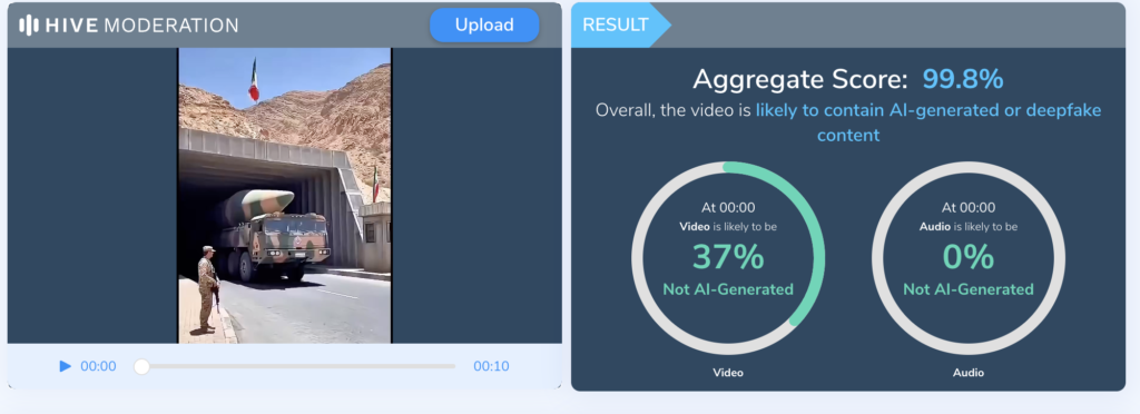 وخلال الفحص عبر أدوات كشف المحتوى المُولَّد، ومن بينها أداة Hive Moderation، أظهرت النتائج أن الفيديو مُولَّد بنسبة 99.8%.
