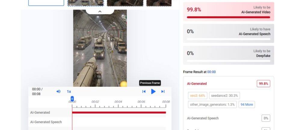 كما أظهرت أدوات الكشف عن المحتوى المولّد بالذكاء الاصطناعي، ومن بينها أداة Hive Moderation، أن الفيديو يحتوي على محتوى مولّد بنسبة 99.8%.