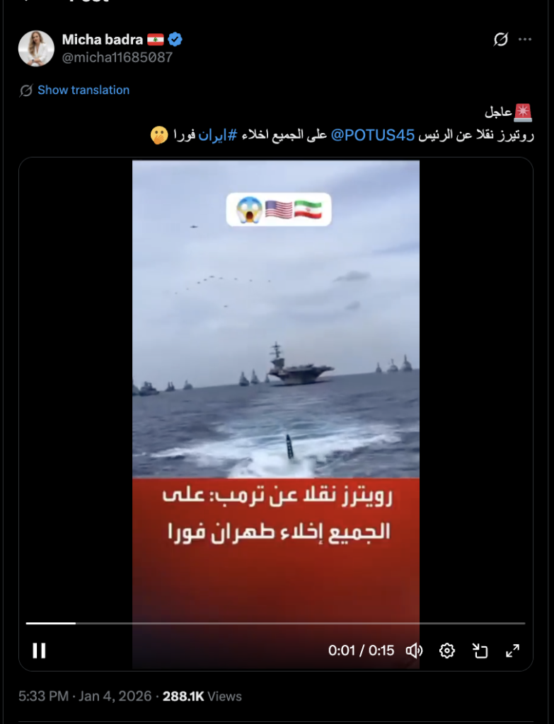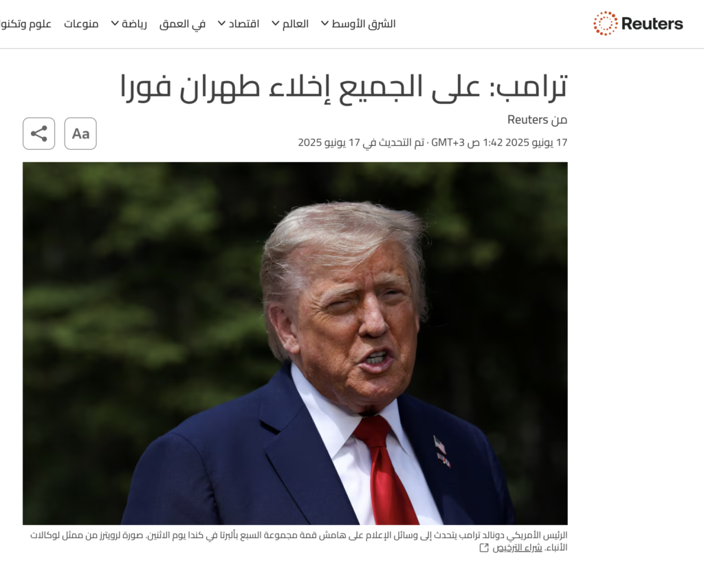 انتشر على مواقع التواصل الاجتماعي تصريحآً حديثاً منسوباً لوكالة رويترز مع الادعاء أن الرئيس الأميركي دونالد ترامب دعا خلال الساعات الماضية إلى إخلاء العاصمة الإيرانية طهران فورًا. وجاء في نص الادعاء: “وكالة رويترز نقلت خلال الساعات الماضية عن الرئيس الأميركي دونالد ترامب أن على الجميع إخلاء طهران فورًا.