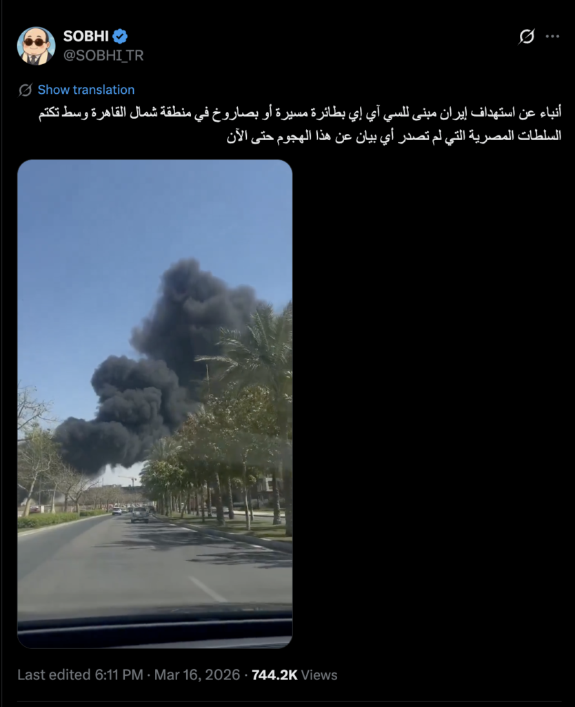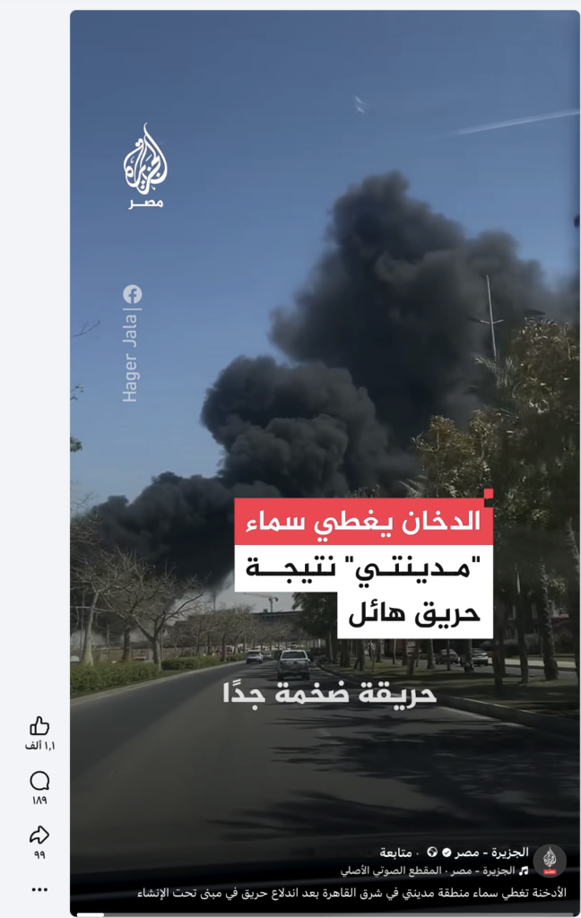 نشرت قناة الجزيرة _ مصر على حسابها الرسمي على الفيسبوك مقطع الفيديو، بتاريخ 16/3/2026، مرفقاً بالوصف التالي: “الأدخنة تغطي سماء منطقة مدينتي في شرق القاهرة بعد اندلاع حريق في مبنى تحت الإنشاء”.