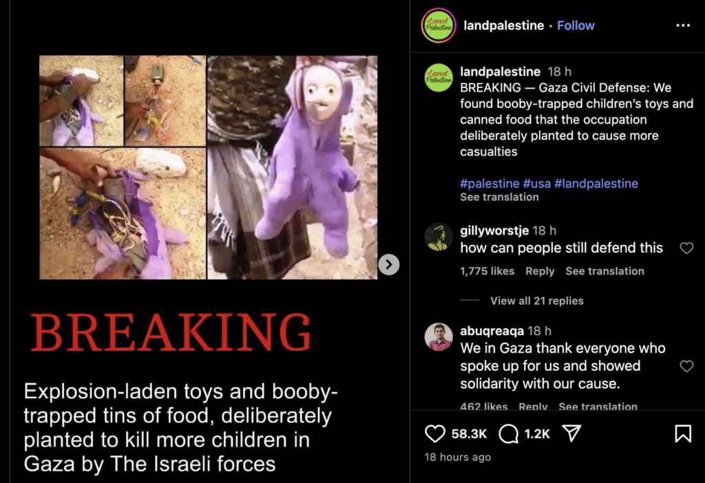 انتشرت على مواقع التواصل الاجتماعي صورة لدمية باللون البنفسجي تحتوي على مواد متفجرة مع الادعاء أن الصورة حديثة لمخلفات الاحتلال في قطاع غزة، حيث أرفقت الصورة مرفقًا لتصريح نُسب للدفاع المدني في غزة جاء فيه: “عثرنا على لعب أطفال ومعلبات طعام مفخخة تعمد الاحتلال زرعها لإسقاط المزيد من الضحايا في أغلب المناطق التي تم الإنسحاب منها خصوصا خانيونس”.