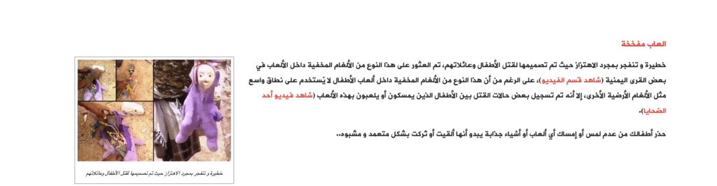 وأرفق الموقع الصورة مع الوصف التالي: “خطيرة و تنفجر بمجرد الاهتزاز حيث تم تصميمها لقتل الأطفال وعائلاتهم، تم العثور على هذا النوع من الألغام المخفية داخل الألعاب في بعض القرى اليمنية”.