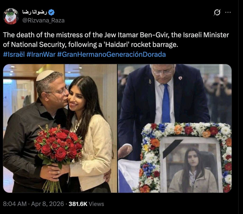 نشرت حسابات على مواقع التواصل الاجتماعي صورة تظهر فيها وزير الأمن القومي في حكومة الاحتلال الإسرائيلي إيتمار بن غفير وهو يقف إلى جانب تابوت، مع الادعاء أن الصورة لمقتل عشيقته بن غفير جراء الصواريخ الإيرانية، حيث أرفقت الصورة بالنص التالي: “مصرع عشيقة اليهودي إيتمار بن غفير وزير الأمن القومي الإسرائيلي إثر رشقة صاروخية حيدريه”.