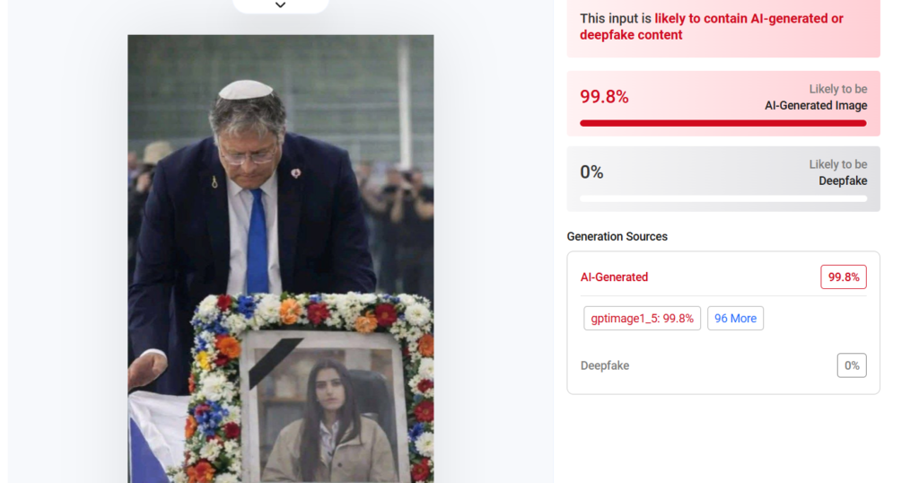 ومن خلال التدقيق في الصورة ظهرت مجموعة من المؤشرات التي تدل على توليدها بالذكاء الاصطناعي، منها: ملامح وجه الفتاة داخل الإطار ناعمة بشكل مبالغ فيه وتفتقر للتفاصيل الطبيعية، وكذلك الإضاءة غير متناسقة بين صورة بن غفير والفتاة في الصورة داخل الإطار، ووجود خلل في الظلال حول الإطار، وتكرار نمط الزهور بشكل غير طبيعي، تفاصيل اليد غير واضحة وتبدو غير دقيقة، إضافة إلى الخلفية التي تبدو بشكل مبالغ فيه وغير واقعية.