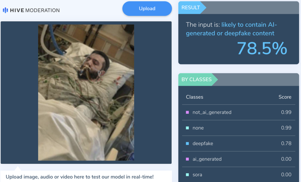 حيث أظهر التدقيق البصري في الصورة أنها مولّدة بتقنيات الذكاء الاصطناعي، وأكد فحصها عبر أداة Hive Moderation أن الصورة مُولّدة بالذكاء الاصطناعي بنسبة 78.5%.