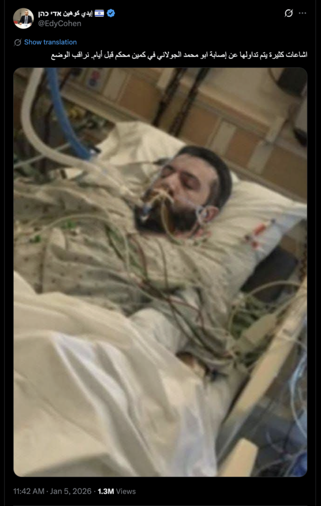 نشرت حسابات على مواقع التواصل الاجتماعي ومن بينها الصحفي الإسرائيلي إيدي كوهين صورة يظهر فيها الرئيس السوري الانتقالي أحمد الشرع وهو على سرير مستشفى، مع الادعاء أن الصورة حديثة وتعود له بعد إصابته في كمين خلال الأيام الماضية. وقد أُرفقت الصورة بالوصف التالي: “إشاعات كثيرة يتم تداولها عن إصابة أبو محمد الجولاني في كمين محكم قبل أيام. نراقب الوضع.”