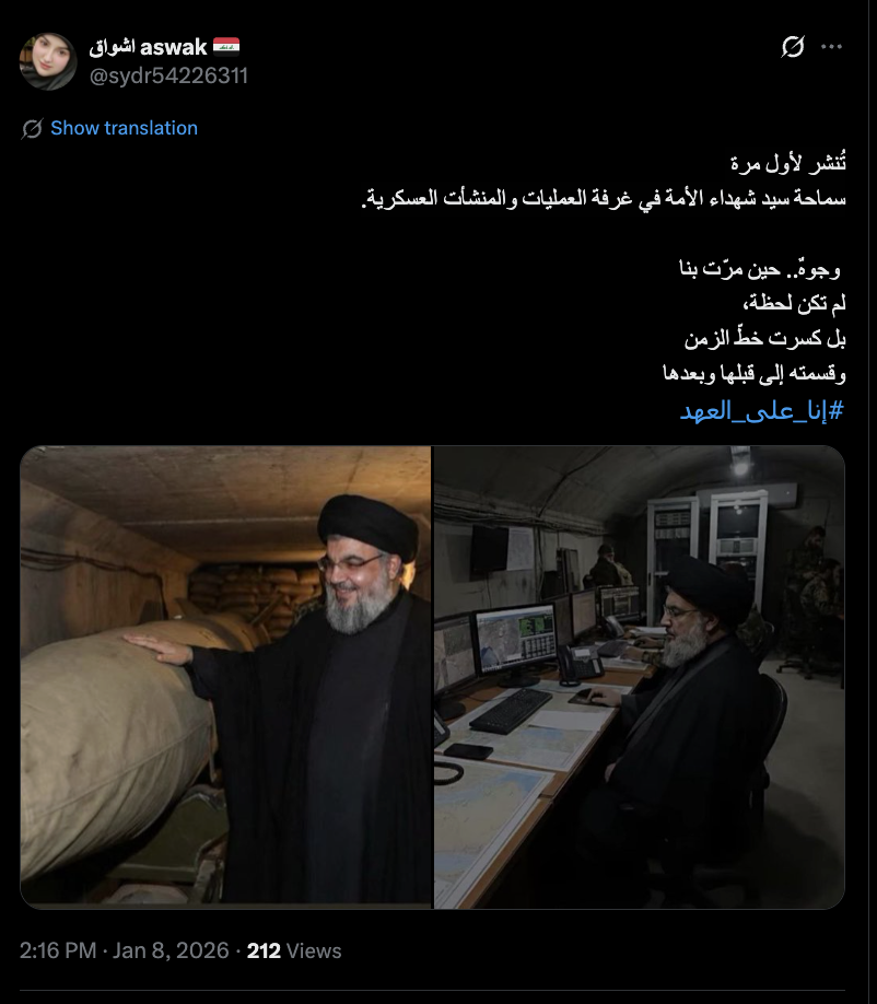 نشرت حسابات على مواقع التواصل الاجتماعي صورتين يظهر فيهما الأمين العام السابق لحزب الله حسن نصر الله داخل منشآت عسكرية وغرف تحكّم، مع الادعاء أن الصور حقيقية وتُنشر لأول مرة. وأُرفقت الصورتان بالنص التالي: “تُنشر لأول مرة سماحة سيد شهداء الأمة في غرفة العمليات والمنشآت العسكرية”.