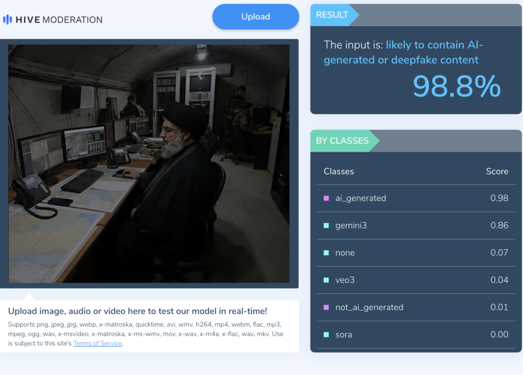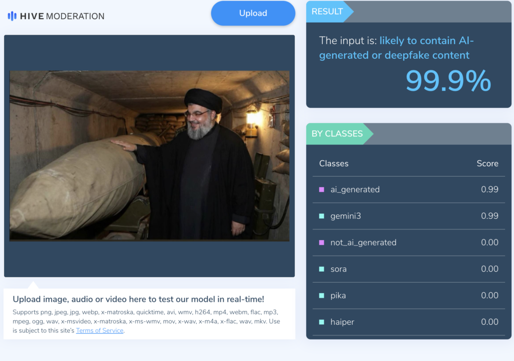 وخلال الفحص عبر أدوات الكشف عن المحتوى المولد بالذكاء الاصطناعي، ومنها أداة Hive Moderation، بيّنت النتائج أن الصورتين مُولّدتان بنسبة 99.9% و98.8%، وهي نسب مرتفعة تشير إلى أن المحتوى غير حقيقي.