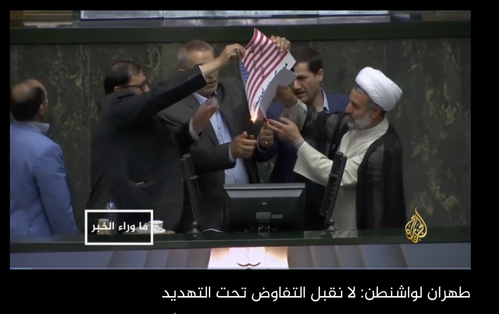 كما ونشرت قناة Sky News مقطع الفيديو على موقعها الإلكتروني، بتاريخ 9\5\2018، مرفقاً بالنص التالي: “أحرق سياسيون إيرانيون علمًا أمريكيًا ورقيًا في برلمان بلادهم احتجاجًا على انسحاب دونالد ترامب من الاتفاق النووي”.