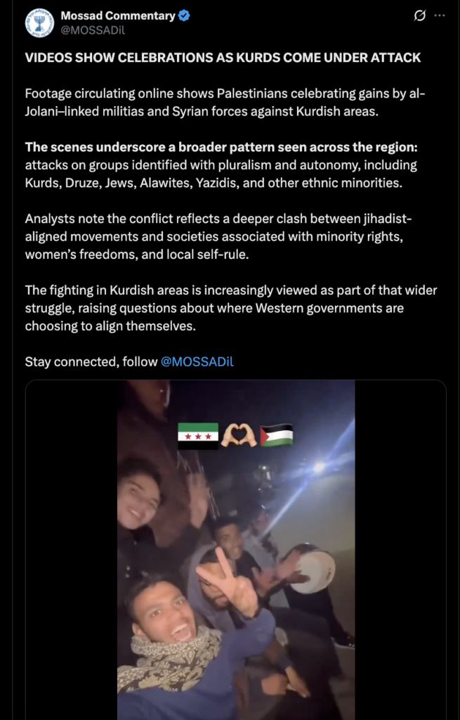 نشرت حسابات إسرائيلية وحسابات ناطقة بالعربية على مواقع التواصل الاجتماعي مقطع فيديو يُظهر احتفالات شبّان من قطاع غزة وتوجيههم تحية من غزة إلى سوريا والثورة السورية بالتزامن مع سقوط بشار الأسد، مع الادعاء بأن الفيديو حديث ويُوثّق احتفالات شبّان في غزة على خلفية الأحداث الأخيرة في سوريا عام 2026. حيث ارفق المقطع بالنص الآتي: “فلسطينيون يحتفلون بالمجازر والحرب التي يشنها الجولاني على الكورد ويطالبونه بقتل المزيد وسحق حقهم بالوجود”.