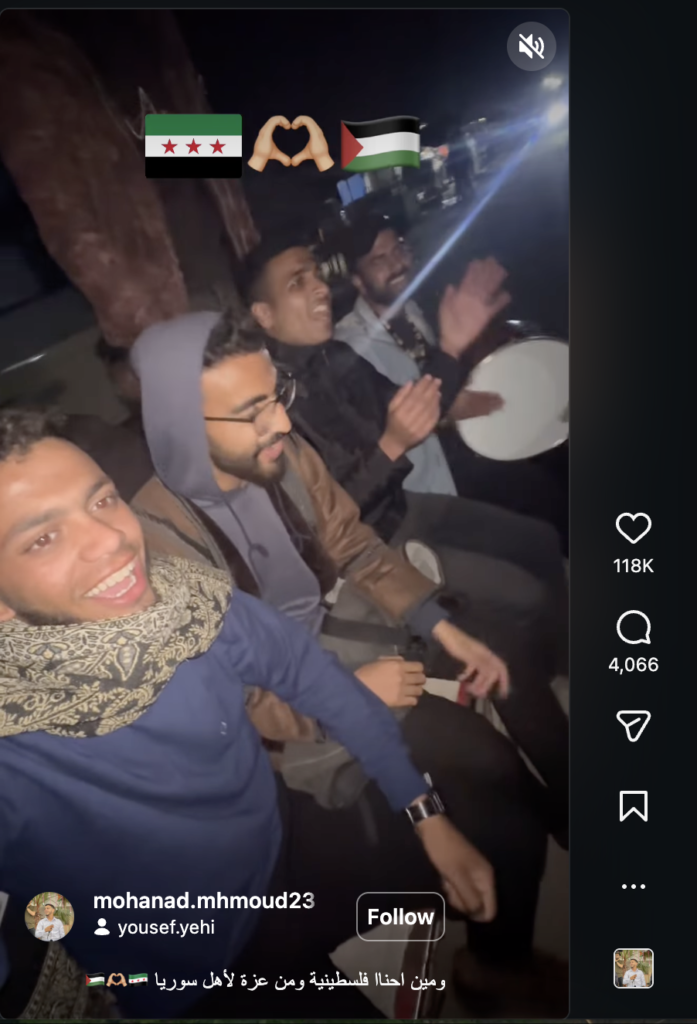 كما ونشر أبو قمر مقطع الفيديو على صفحته في منصة الإنستغرام بتاريخ 10/12/2024 مرفقًا بالوصف التالي: “ومين احنا فلسطينية ومن غزة لأهل سوريا”.