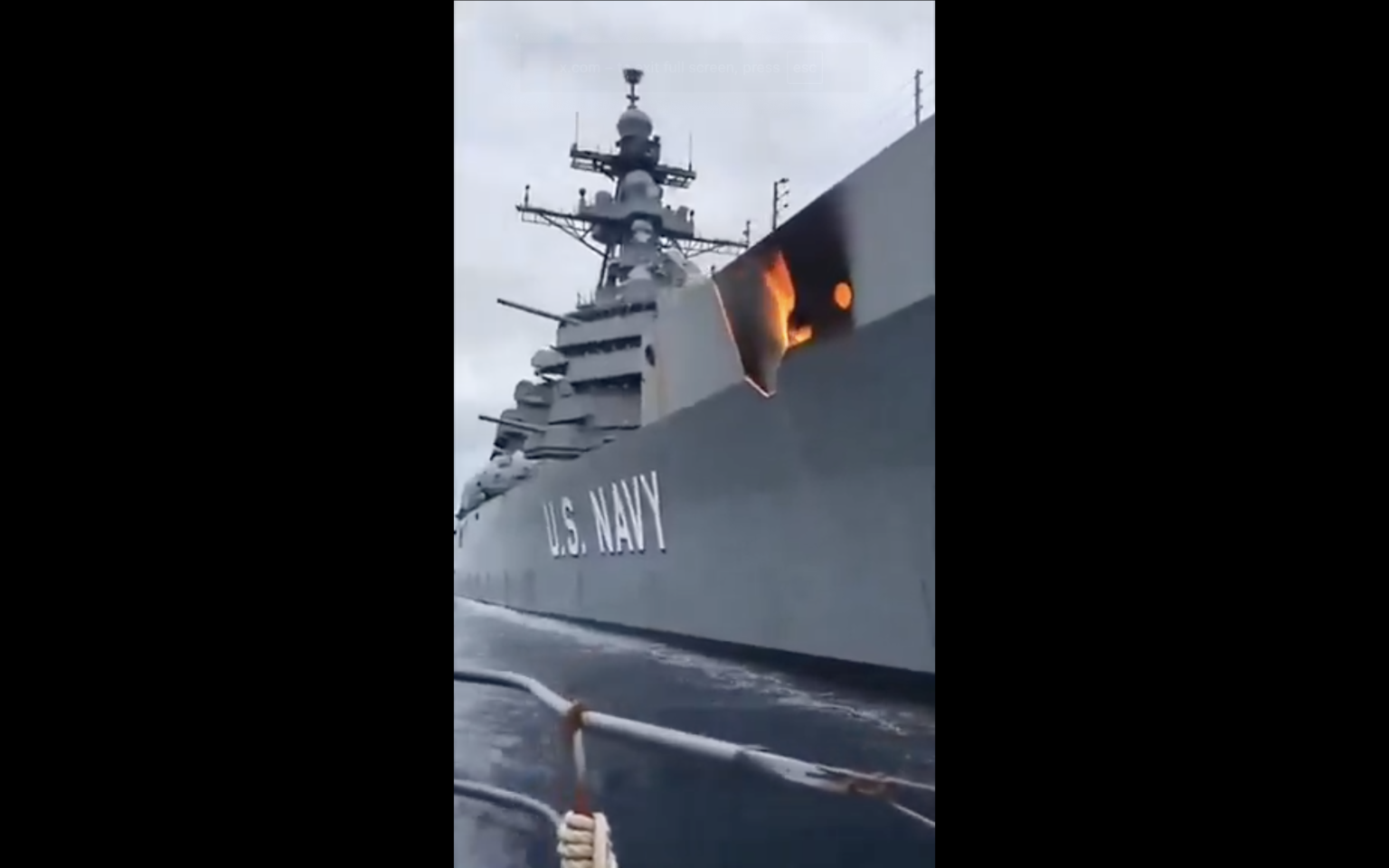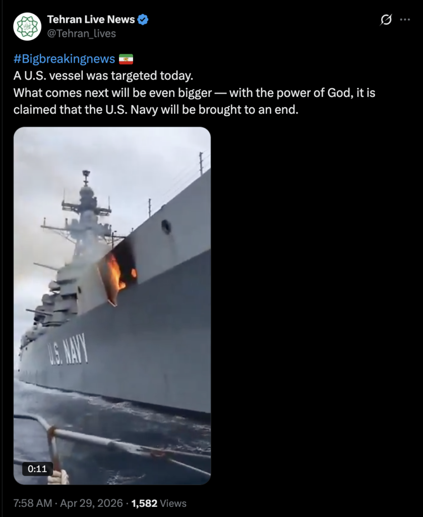 نشرت حسابات على مواقع التواصل الاجتماعي مقطع فيديو يظهر فيه استهداف سفينة أمريكية، مع الإدعاء أن الفيديو حديث ويوثق عملية استهداف مباشرة، حيث أرفق الفيديو بالنص التالي: “استهدف سفينة أمريكية اليوم.ما سيأتي بعد ذلك سيكون أكبر بكثير بقوة الله، يُزعم أن البحرية الأمريكية ستُنهى”.