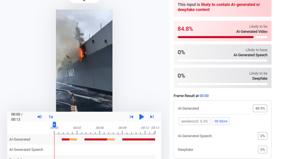 تحقّق مرصد كاشف من صحة الفيديو، ووجد أنه غير حقيقي ومولّد بتقنيات الذكاء الاصطناعي. ومن خلال التدقيق في الفيديو، ظهرت مجموعة من التشوهات البصرية التي تدل على ذلك، أبرزها:  تشوه في حركة الأمواج وعدم انسيابها مع السفينة، إضافة إلى اشتعال النيران على متن السفينة  يبدو غير واقعي ومصطنع، تشابه الحواف وتكرارها في الأسلاك على متن السفينة بشكل غير طبيعي.