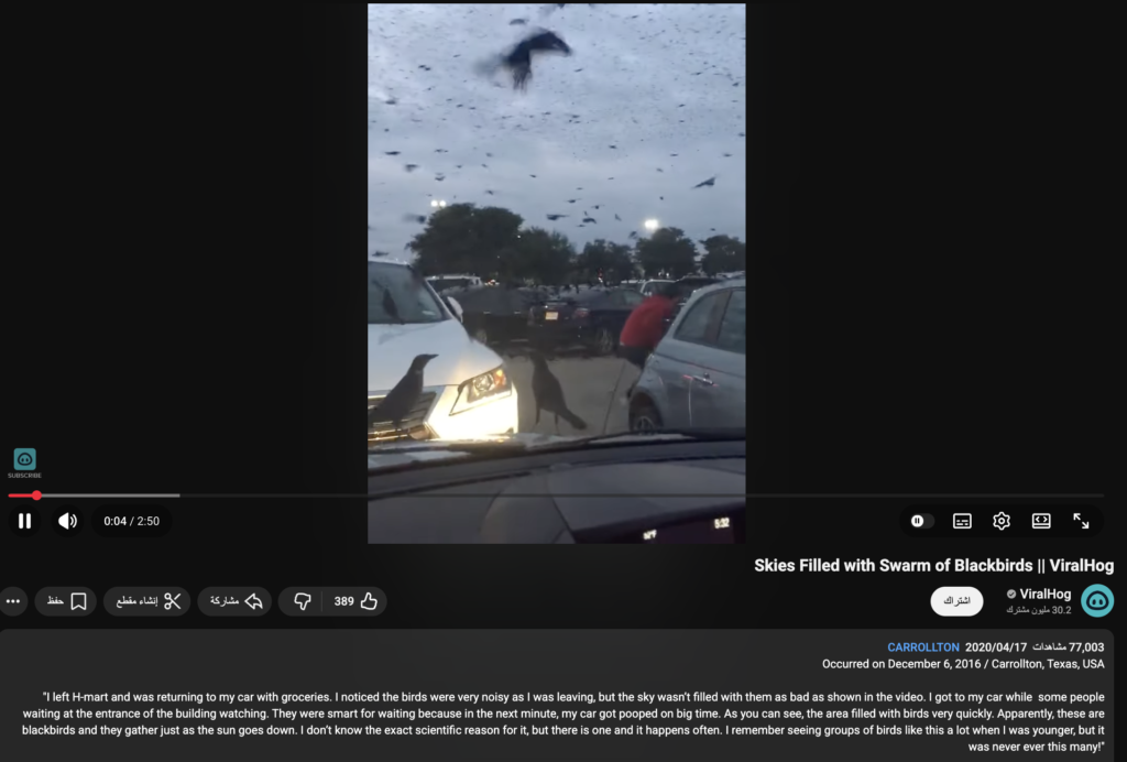 كما نشر موقع topky.sk الفيديو عام 2016 مرفقًا بالوصف التالي: “خيّم جوٌّ من الخوف على موقف سيارات في تكساس عندما انقضّ عليه سربٌ ضخم من الطيور فجأةً. حلّقت الغربان السوداء أولًا فوق المنطقة، ثم شنّت هجومًا خاطفًا”.
