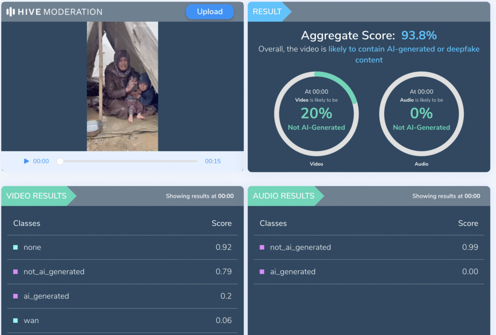 وخلال الفحص عبر أدوات الكشف عن المحتوى المولّد، ومنها أداة Hive Moderation، أظهرت النتائج أن الفيديو مُولّد بنسبة 93.8%، وهي نسبة مرتفعة ضمن تصنيف المحتوى غير الحقيقي.