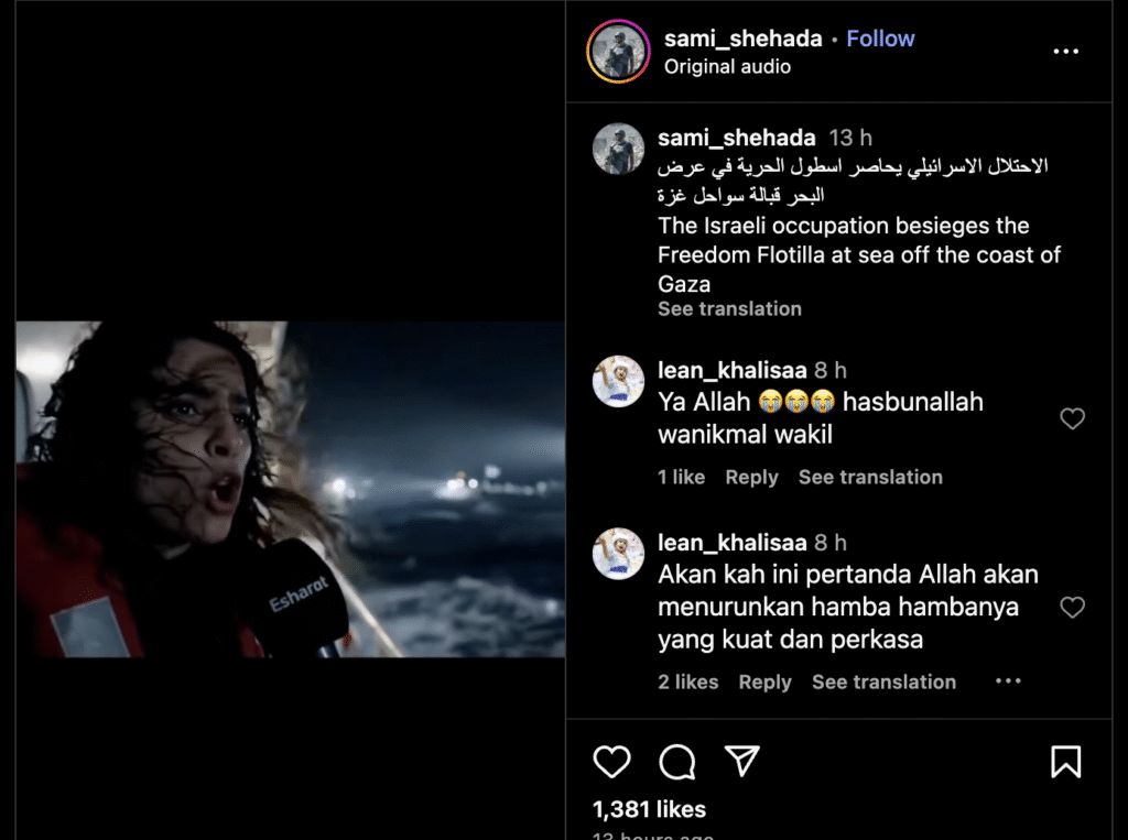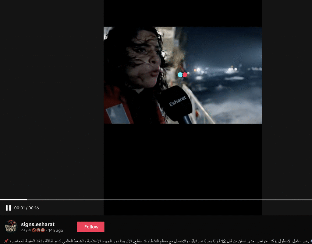حيث نشر الفيديو حساب يدعى signs.esharat على منصة التيكتوك وهو متخصص بنشر مقطع الفيديو المولدة بالذكاء الاصنطاعي بتاريخ 1\10\2025، مرفقًا بالوصف التالي: ” خبر عاجل الأسطول يؤكّد اعتراض إحدى السفن من قبل 12 قاربًا بحريًا إسرائيليًا، والاتصال مع معظم النشطاء قد انقطع. الآن يبدأ دور الجهود الإعلامية والضغط العالمي لدعم القافلة وإنقاذ السفينة المحاصرة”.