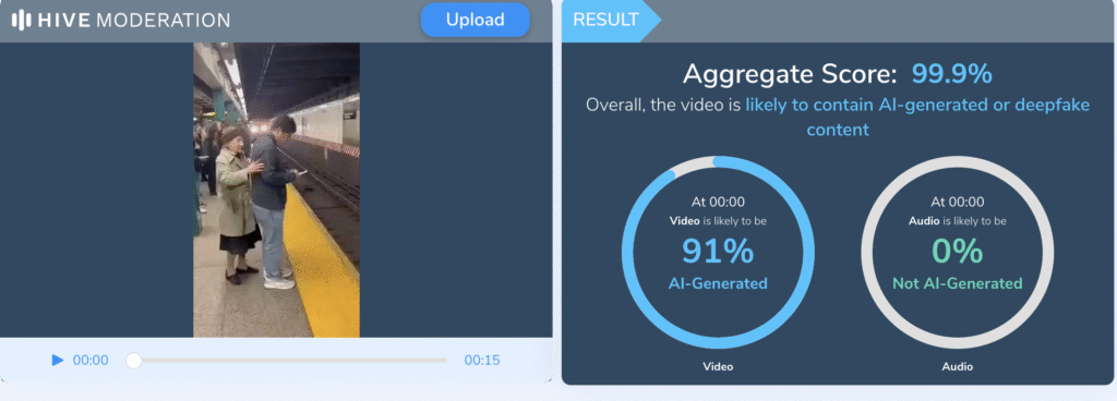 وخلال الفحص عبر أدوات الكشف عن المحتوى المصطنع، ومنها أداة Hive Moderation، بيّنت النتائج أن الفيديو مُولّد بنسبة 99.9٪، وهي نسبة مرتفعة تؤكّد أن المحتوى غير حقيقي.