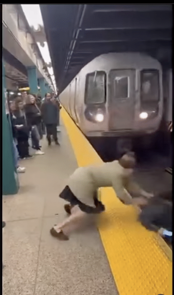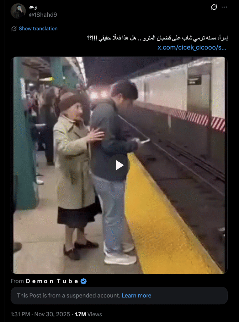 انتشر على مواقع التواصل الاجتماعي مقطع فيديو يظهر فيه سيدة داخل محطة قطار تقوم بدفع رجل نحو سكة القطار لحظة مرور القطار، مع الادعاء أن الحادثة حقيقية، حيث أُرفق المقطع بالوصف التالي: “إمرأة مسنّة ترمي شابًا على قضبان المترو”.