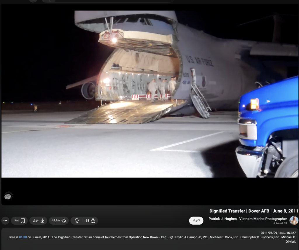 وبالتدقيق من المعلومات نشر حساب PatrickJHughes على قناته على اليوتيوب بتاريخ 9/6/2011، فيديو يُظهر نقل جثامين جنود أمريكيين من داخل طائرة، معلقاً بأنه تم نقل أربعة جثامين لجنود أمريكيين عادوا من العراق إلى ديارهم.