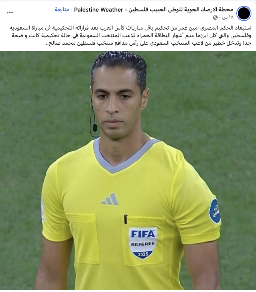 انتشرت على مواقع التواصل الاجتماعي معلومات مع الادعاء أن اللجنة المنظمة لبطولة كأس العرب 2025 أعلنت استبعاد الحكم المصري أمين عمر من إدارة باقي مباريات البطولة، على خلفية القرارات التحكيمية المثيرة للجدل التي شهدتها مباراة فلسطين والسعودية. وجاء في نص الادعاء: “قررت اللجنة المنظمة لبطولة كأس العرب استبعاد الحكم المصري أمين عمر من إدارة باقي مباريات البطولة، وذلك على خلفية القرارات التحكيمية المثيرة للجدل التي شهدتها مواجهة السعودية وفلسطين”.