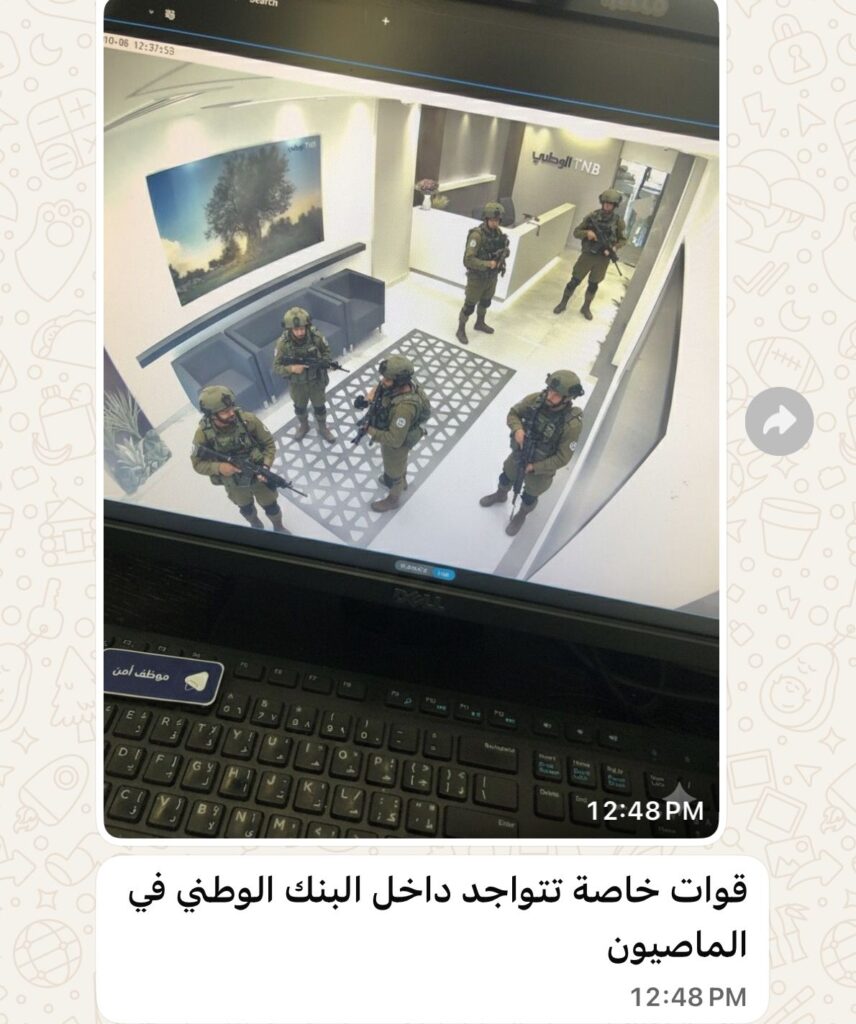 انتشرت على مجموعات الواتساب صورة يظهر فيها مجموعة من جنود الاحتلال مع الادعاء أنها تعود لاقتحام البنك الوطني في الماصيون، بمدينة رام الله.