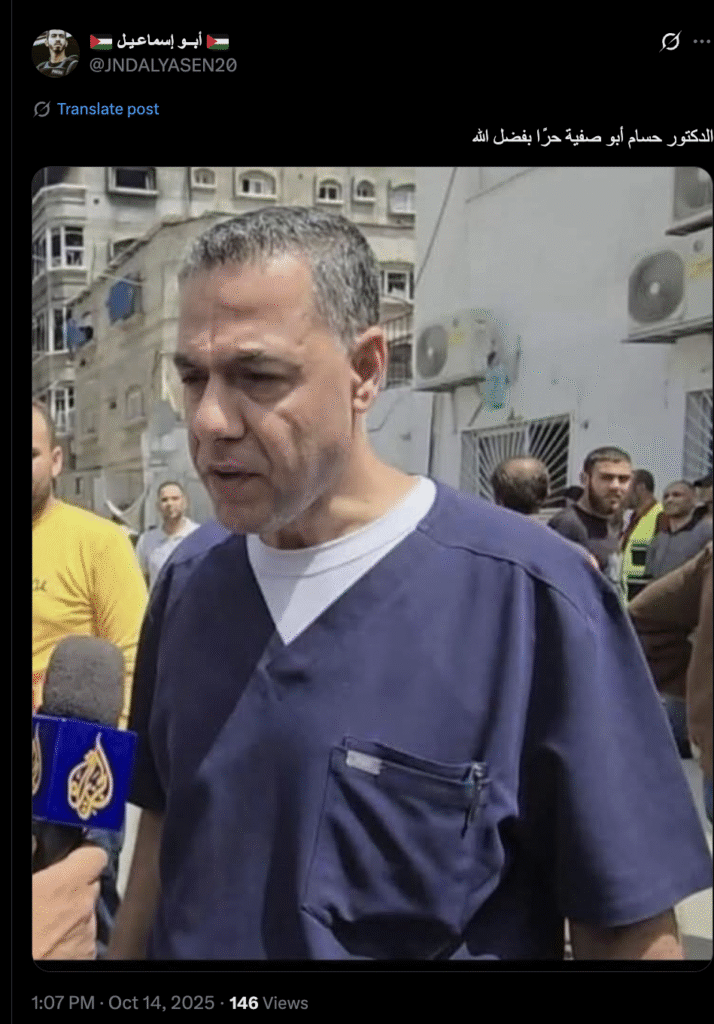 انتشرت على مواقع التواصل الاجتماعي معلومات حول الإفراج عن الدكتور حسام أبو صفية من سجون الاحتلال في صفقة التبادل بين حركة حماس والاحتلال الإسرائيلي.