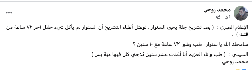 انتشرت على مواقع التواصل الاجتماعي معلومات نُسبت إلى الإعلام العبري تدعي أنه بعد تشريح جثمان رئيس المكتب السياسي السابق لحركة حماس يحيى السنوار، توصل الأطباء إلى أن السنوار لم يأكل شيئًا قبل 72 من استشهاده، حيث جاء في الادعاء: “الإعلام العبري: بعد تشريح جثة يحيى السنوار، توصّل أطباء التشريح إلى أن السنوار لم يأكل شيئًا خلال آخر 72 ساعة من مقتله”.
