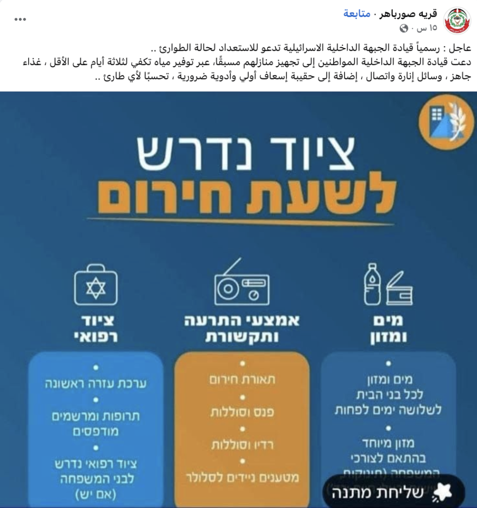 انتشرت على مواقع التواصل الاجتماعي ومجموعات الواتساب رسالة تحذير نُسبت إلى قيادة الجبهة الداخلية في حكومة الاحتلال، تدعو للاستعداد لحالة طوارئ، وتدعو المواطنين لتجهيز منازلهم وتوفير مياه وغذاء ووسائل إنارة تكفي لثلاثة أيام على الأقل. وجاء في نص الادعاء: “قيادة الجبهة الداخلية تدعو للاستعداد لحالة طوارئ.