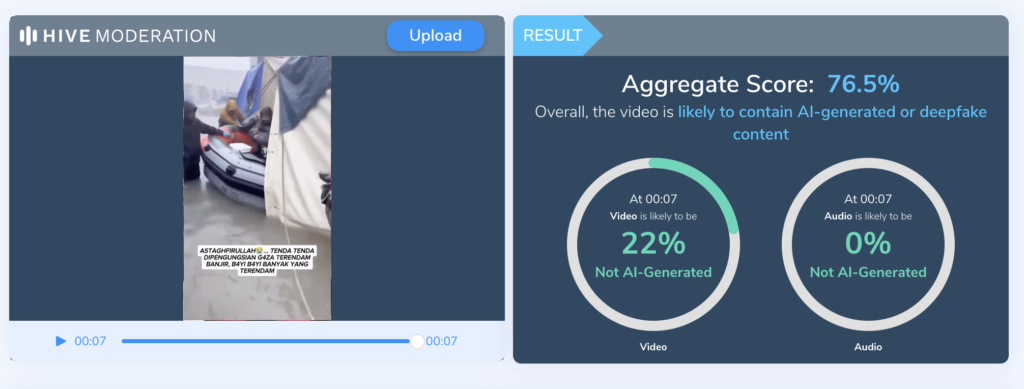 وخلال الفحص عبر أدوات الكشف عن المحتوى المولَّد، ومن بينها أداة Hive Moderation، أظهرت النتائج أن الفيديو مولَّد بنسبة 76.5%.