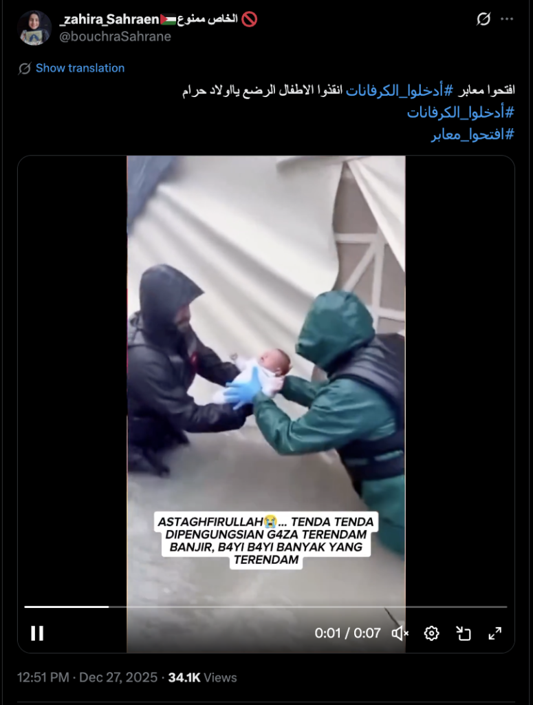 انتشر على مواقع التواصل الاجتماعي مقطع فيديو يظهر فيه مجموعة من الأشخاص يحملون أطفالًا رُضَّع من داخل الخيام بسبب غرقها بمياه الأمطار، مع الادعاء أن الفيديو من قطاع غزة خلال المنخفض الجوي الأخير. وقد أُرفق الفيديو بالوصف التالي: